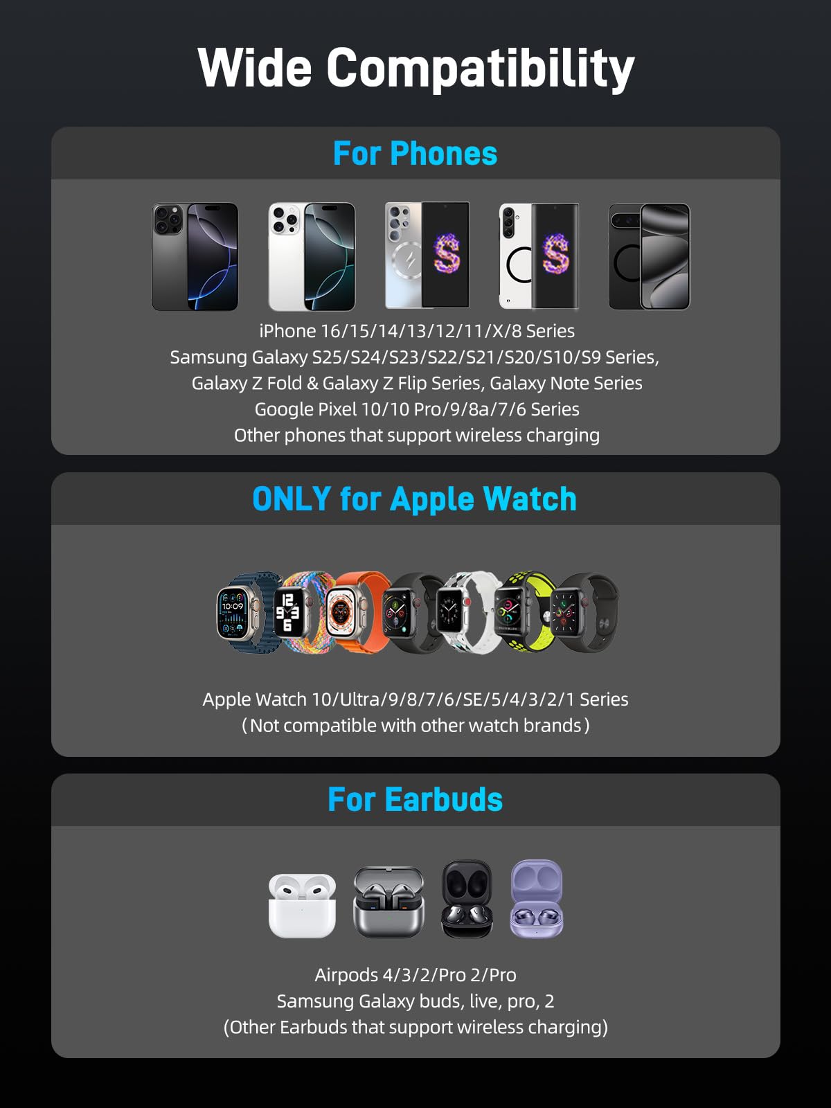 - Elegance Meets Durability:The 3-in-1 wireless charger makes a fantastic gift for family, friends, or anyone who appreciates a sleek and efficient charging solution. Elevate your charging game with the charging station—where innovation meets everyday convenience